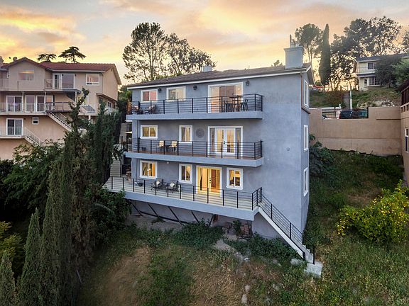 Exceptional gated contemporary home on three levels with amazing views from every floor. This Sierra Vista area home in Northeast Los Angeles boasts five bedrooms, five baths, a study, and multiple entertaining areas. Enter on the main/top level to a large open-concept living and dining space with fireplace and adjoining kitchen and breakfast area. A balcony, powder room and direct access to the three-car garage complete the main floor. The middle level below includes a master retreat with fireplace, balcony access, a spa-like bath and walk-in closet. There is a private study, laundry, and two additional bedrooms and a bath on this level. The lower level of the home contains two more bedrooms with walk-in closets, a third balcony, and an additional living room with kitchenette. In addition to the balconies, there is an abundance of outdoor lounging areas and storage including a large private entertaining area with gardens. The residence is also an income earner with the unique ability to have two simultaneous separate ''lock-off'' areas with private entrances for Airbnb income. This home is a wonderful, private, entertainer's dream with endless views. Convenient to Highland Park and South Pasadena restaurants and shopping.