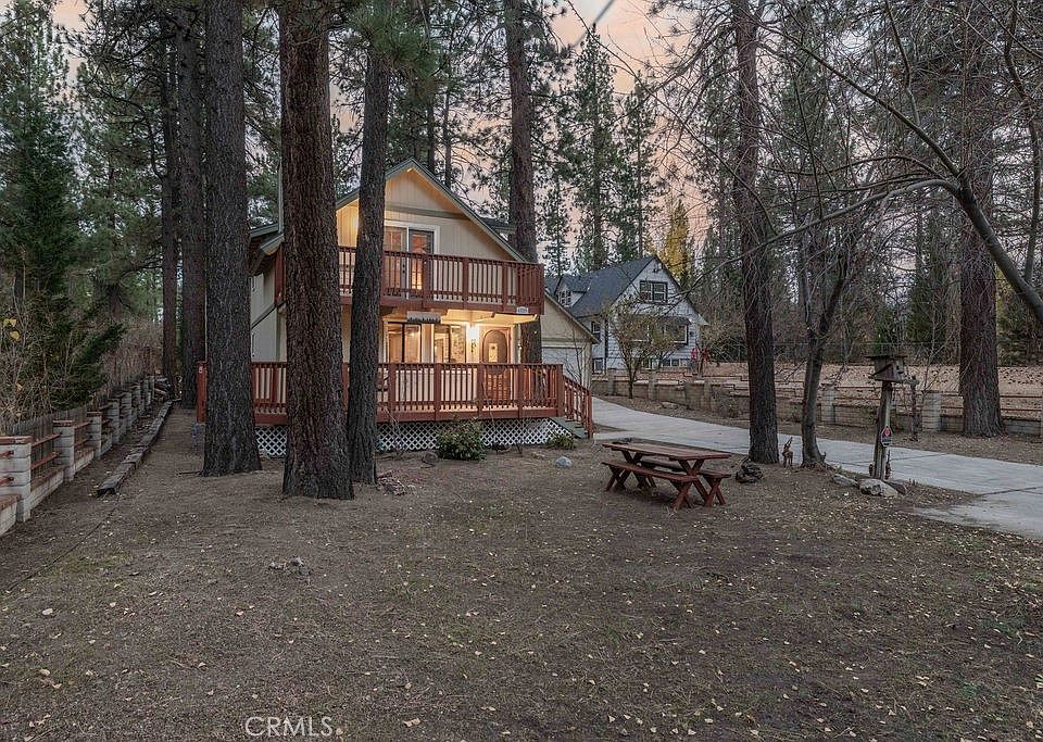 Welcome to one of the best-located cabins in Big Bear Lake, offering exceptional walkability, quick access to major attractions, and the convenience so many buyers value today! From this home, you can walk to multiple dining options, both grocery stores, Starbucks or Moonridge Coffee, and the ski shuttle, or enjoy a peaceful stroll along the paved Rathbun Creek trail that winds through lower Moonridge. Prefer to drive? Easy—reach Snow Summit, Bear Mountain, Big Bear Lake, the golf course, the zoo, and the Village, all in approximately three minutes! Few areas in Big Bear offer this combination of centrality and ease. Set on a beautifully treed 7,800 sq ft lot, this warm and inviting two-story cabin blends charm, comfort, and functionality. Step inside to a spacious living room with exposed wood beams and a lovely fireplace, with the dining area and kitchen connecting seamlessly and featuring granite counters, stainless appliances, and beautiful wood cabinetry. Step out onto the expansive back deck, an ideal space for relaxing or entertaining among the pines. Upstairs, two generously sized bedrooms offer vaulted ceilings, wood accents, and peaceful treetop views. With two full bathrooms, a laundry area, and a practical 1,112 sq ft layout, the home lives comfortably and conveniently. Outside, the property provides a nice combination of usability and privacy, including a fenced perimeter and a large concrete driveway with plenty of parking space, and a detached garage, all surrounded by a natural, low-maintenance treed setting. Whether you’re seeking a centrally located getaway, a full-time home, or a property with excellent lifestyle and rental appeal, this Fox Farm gem delivers the perfect blend of accessibility, mountain charm, and year-round convenience in one of Big Bear’s most desirable neighborhoods!