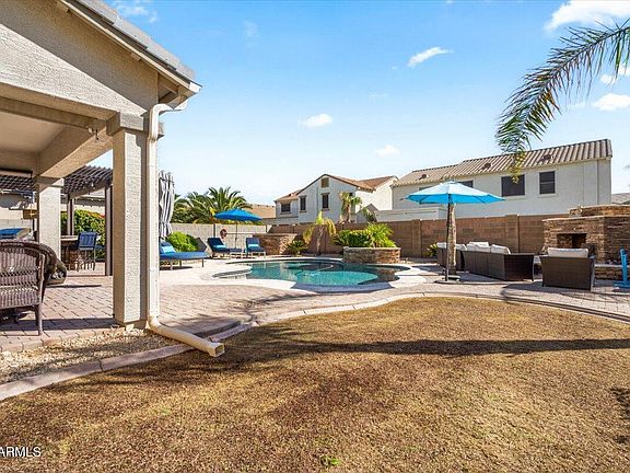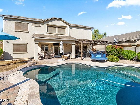 Discover this spacious 5-bedroom home with a private pool in San Tan Valley, Arizona, offering the perfect blend of comfort, versatility, & resort-style living. Nestled in a prime location near The Pork Shop, new shopping, dining, & scenic community parks, this Taylor Morrison Legend model spans 3,460 sq. ft. with a 3-car tandem garage on a 7,389 sq. ft. lot. The flexible floor plan includes formal living & dining areas, a large family room, & a versatile bonus room ideal for an office, gym, or media space. BOTH HVAC UNITS REPLACED 2020, GUTTERS ADDED 2020,OVERHEAD STORAGE IN GARAGE 2022,PATIO SLIDER 2023,HYBRID WATER HEATER 2023, KITCHEN APPLIANCES 2023, KITCHEN BACKSPLASH 2023. Step into your own backyard retreat featuring a pebble tech pool, BBQ island, pergola, & outdoor fireplaceperfect for entertaining or relaxing under Arizona skies.