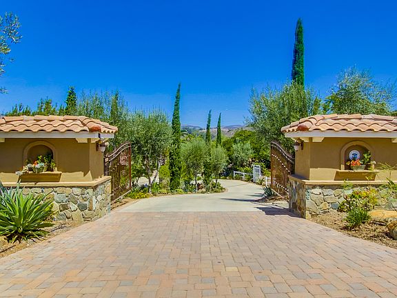 Dream Estate with endless Panoramic Mountain Views. This privately gated Custom-built Villa Offers both country-living with city-close amenities. Quickly fall in love with the peaceful surroundings and beauty. Sprawling yet low maintenance, Let the thoughtfully designed 4.5 acres WOW you with your own vineyard, wine-cellar, bocce ball court, horse stables+corral, aviaries, fruit trees, gardens & be surprised by more. Under the Stars Dining w/Kitchen, BBQ, Pizza Oven & Fire-pit. Room for a pool & casita.