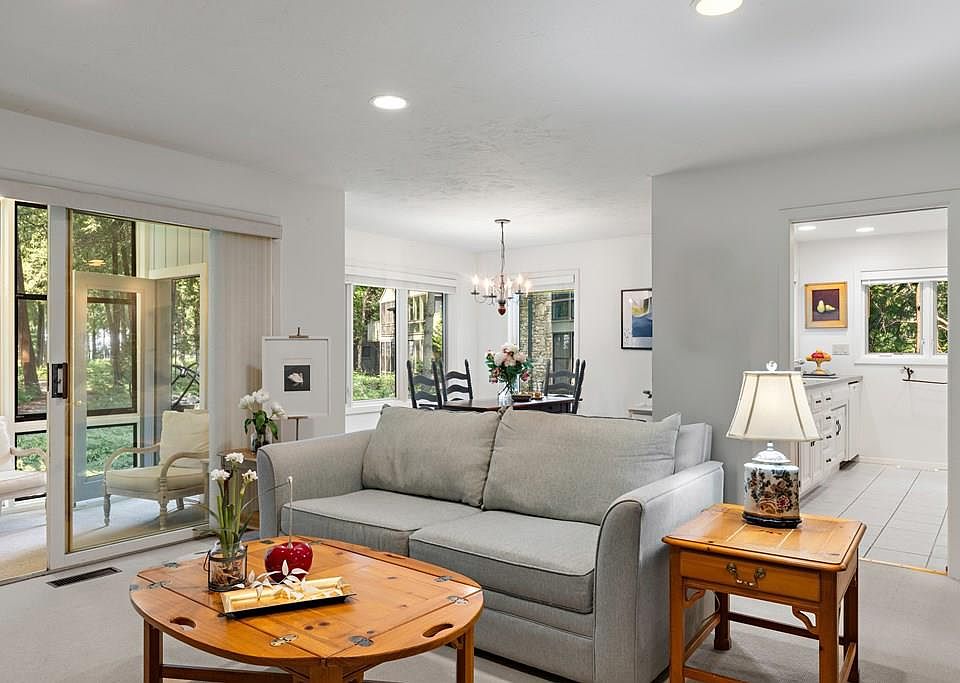 Tucked away, just off Main Street, in the heart of Fish Creek, Hidden Harbor offers the perfect blend of privacy, comfort, and convenience. This exceptional first floor end unit features an open floor plan anchored by a stunning fieldstone fireplace and a four seasons porch. First floor primary ensuite with two generous guest rooms. Set within a beautifully landscaped 14 acre community with 2,000 feet of shoreline, Hidden Harbor is perfect for year round living or a second home. A heated in-ground pool located at the shore, pickleball and tennis courts, pier, walking trails and marina are part of this sought after iconic development. Become a part of this exclusive community. Turnkey.