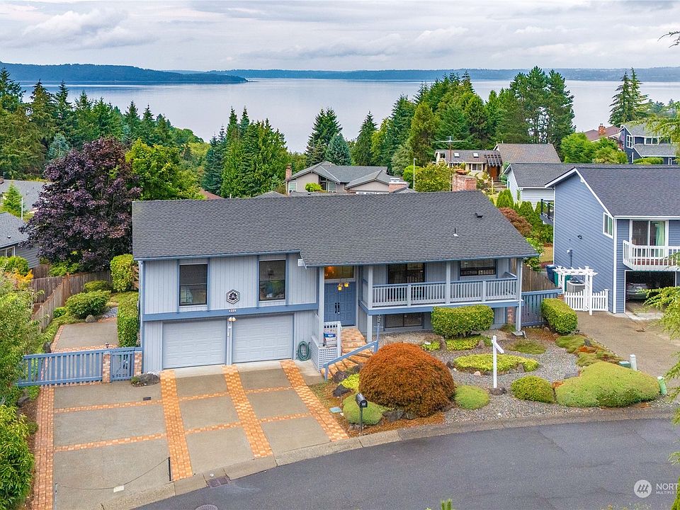Twin Lakes home w/awe-inspiring panoramic Olympic Mountain & Puget Sound views from every level! This one-owner home is well-maintained, recently refreshed & move-in ready! Pre-inspected with recommended repairs complete. Freshly painted exterior & interior, updated kitchen w/quality cabinets & countertops, new carpet & LVP flooring. The upper level has a spacious fireside living room, dining room & open-concept kitchen, a large primary suite plus 2 add'l bedrooms. Downstairs is a bistro-style bar & fireside family room plus 2 add'l bedrooms. Celebrate the changing Pacific NW seasons on your 180-degree entertainment-size view deck under the covered structure above & fully weatherproof patio below! Walk & enjoy the easy-care landscaped yard.