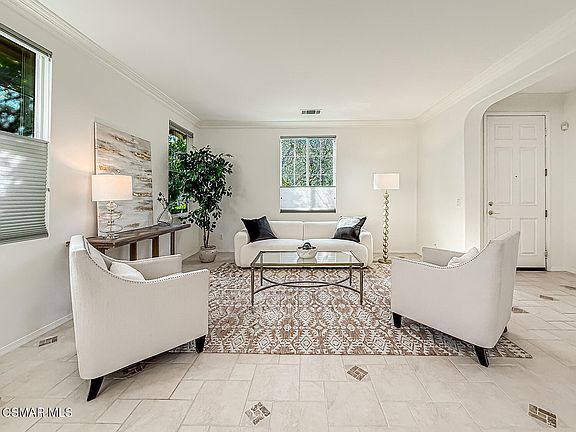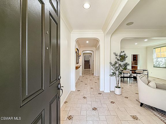 Scenic views and DOWNSTAIRS primary suite!! This beautiful former model home is located in the highly sought-after, gated community of Toscana @ Serenata in Moorpark. It is situated toward the end of a cul-de-sac, surrounded by beautiful mountain views. This home has 3 bedrooms plus an office (which could be converted into a 4th bedroom), formal living room, dining room, family room, a large kitchen and a butler's pantry with a wine fridge. The kitchen has granite countertops, stainless steel appliances--microwave, double ovens and cooktop with a hood range. The large island boasts plenty of storage space and seating area. The kitchen is open to the large family room with built-ins, a fireplace and windows for natural lighting. The huge primary bedroom suite is conveniently located on the main level featuring two large walk-in closets with custom built-in organizers, a large en-suite bathroom with an oversized shower, tub, two vanities plus a make-up vanity. Also on the first floor is a large office with two built-in desks, cabinets and shelves. The laundry room has a sink and cabinets. Two spacious bedrooms upstairs feature walk-in closets and a connecting bathroom with a private individual sink room for each bedroom. Built-in cabinets and desks are located outside the upstairs bedrooms. The backyard offers sweeping views of the surrounding hills and neighborhood. The oversized 3-car tandem garage has epoxy-coated flooring and storage area. Other features of the home include recessed lights throughout, high ceilings, dual-zone HVAC, recirculating water heater, ample storage space, built-in cabinets, and tons of upgraded finishes. Close to hiking trails, parks, shopping centers and the freeway. Don't miss the opportunity to call this place home!