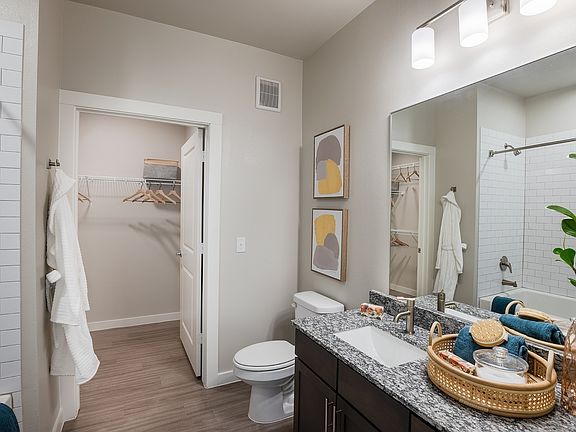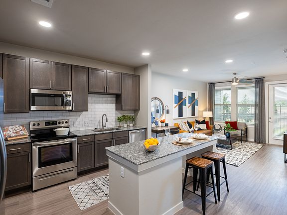 - Exterior features: Bicycle storage, Business Center, Electric vehicle charging stations, Granite countertops throughout, On-site dog parks and dog wash, Package Receiving, Private yards in select units, WiFi throughout all common areas, Wood-vinyl plank flooring throughout every home