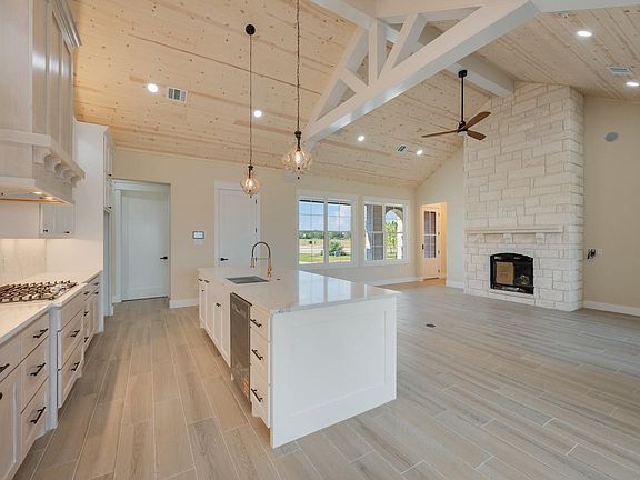 Gas fireplaceDedicated officeQuartz countertopsSplit floorplan enhances privacyWood ceiling accentsGas cooktopCustom cabinetry