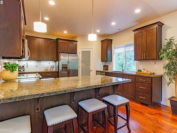 Gorgeous 2013 built contemporary in secluded neighborhood of prestigious homes, close to everything South Eugene has to offer. The main level features an open floor plan, including a gourmet kitchen with stainless steel appliances, granite counters, a large pantry and an eating bar. You'll find a spacious dining area and light-filled living room with stunning vaulted ceilings, Acacia wood floors, gas fireplace, built-ins, and a wet bar. The main level includes a primary suite with a generously sized walk-in closet, as well as an additional bedroom (or office). Upstairs, you'll find two more bedrooms and a large family room, all with beautiful brand-new carpeting. Sliding doors off the dining area lead to a large covered deck overlooking the serene natural surroundings and a private, easy care yard. The property backs to an undeveloped green space owned by the HOA. Fantastically located with desirable schools and beautiful views of Spencer Butte. This lovely, move-in-ready home is truly a rare find. OPEN HOUSE 5/31 & 6/1,SAT & SUN 1-3.