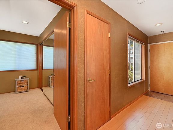 This corner, top floor unit overlooking Puget Sound and its islands and mountains in the distance, lives large in a small, quiet 8 unit complex. From the front door of the unit throughout the living area is hardwood maple flooring. Besides the view, the living area is open space to the kitchen decked out in wood cabinets, granite countertops, stainless steel appliances, washer/dryer, and breakfast bar. Living area encompasses a small eating area, fire place and room for entertaining. Or just head for the deck and enjoy. Large, private bedroom has new carpeting, large closet including built-ins, double paned windows. Full bath is upgraded w/heated floors, granite counter top and ample storage and lighting. Owned carport parking #4 & storage.