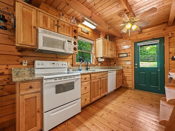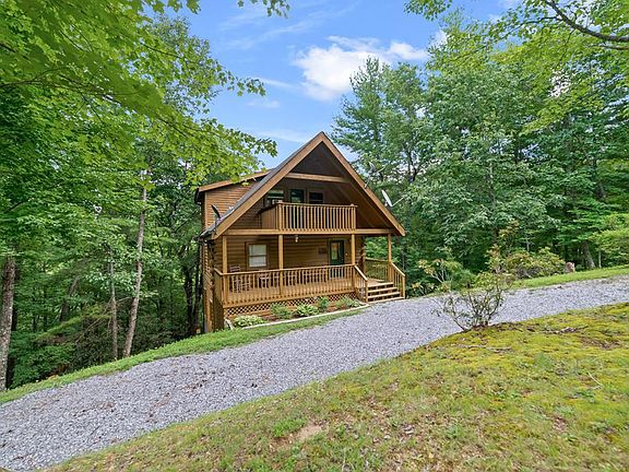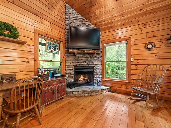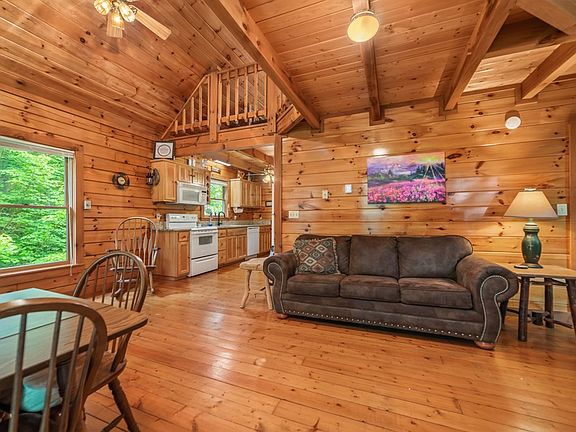 Peaceful and privacy describe the location of this 2 Bedroom, 2 bath cabin with a loft surrounded with lots of Rhododendrons, Mountain Laurels and mature trees. There are 5 Covered decks for plenty of area to enjoy the outdoor. Each of the three levels of the cabin offers its own unique experience. The main level feature a great room with a gas fireplace and a full bath. The kitchen has granite counter tops and solid wood cabinets. Off the living/dining area is access to a large covered deck. The cathedral ceiling reaches all way to the top of the loft. Take the stairs to the loft and you with find a large area with three trundle beds, a table and chairs and access to the front and back covered decks. On the bottom level is large room which currently used as a bedroom with a large king bed, There is a full bath with a walk-in tiled shower. Also you can exit to the lower covered deck to enjoy the wide open spaces. Make this your next over-night rental investment. It can sleep 12 people, Or it can be your very own Smoky Mountain vacation retreat. Cabin comes complete with furniture and appliances and TVs.