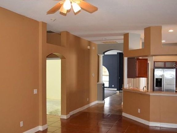 Wesley Chapel Seven Oaks home backing to conservation! Offering 2,083 square feet, 4 bedrooms, 2 full bathrooms and a 2 car garage. Great layout with a shared living/dining room space that greets you right from the start and then leads to a 20x12 family room. Custom and unique inlay tile centered in the room. Kitchen includes a breakfast nook, lots of cabinet space, closet pantry and cutout with breakfast bar. The Master Suite has walk in closet, dual sinks and garden tub with separate shower. The beautiful wooded backyard can be enjoyed from the screened in lanai with access from both the family room and master bedroom. Seven Oaks offers a community clubhouse, multiple pools, tennis & basketball court, playgrounds and much more. Conveniently located to the interstate, shopping and restaurants. It's good to be home. This property may qualify for Seller Financing (Vendee).