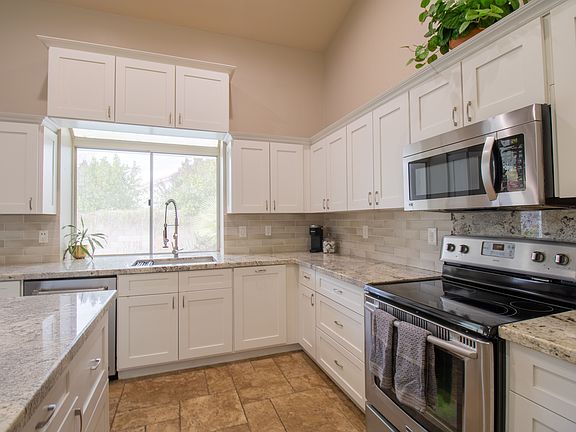 Welcome to your dream residence an exquisitely remodeled 3-bedroom, 2-bath sanctuary that blends modern sophistication with serene desert living. From the moment you step inside, you'll be captivated by the airy, expansive vaulted ceilings open layout and high-end finishes, including stunning white granite countertops, custom shaker-style cabinetry, and sleek, designer bathroom fixtures that harmonize effortlessly throughout the home.