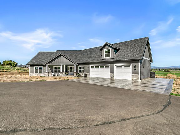 An absolute treasure on Old Stage Rd, truly 1 of a kind & a must tour. Nothing like it on the market today. 1 owner custom 2020 built home w/gated entry, privacy, irrigation rights, high producing well (per owner), perfect for horses, fenced & cross fenced, & sweeping views of green fields, Table Rocks & Mt. McLoughlin. Single-level design w/bonus theater & 1/2 bth upstairs, vaulted ceilings, wide hallways, & too many upgrades & extras to list. Gourmet kitchen has granite island, custom cabinets, KitchenAid SS appliances, gas cooktop, wine fridge, & kitchen pantry. Spacious primary suite offers dual walk-in closets w/built-ins, custom wood feature wall, soaking tub, walk-in shower, granite counters, & private views. Split bedroom floorplan includes Jack & Jill bedroom, 4 bedrooms, 2 offices, & multiple baths. Oversized 3-car insulated garage w/220 power, xtra storage & RV parking. Back yard features covered stamped patio, extensive concrete, play structure & incredible panoramic views