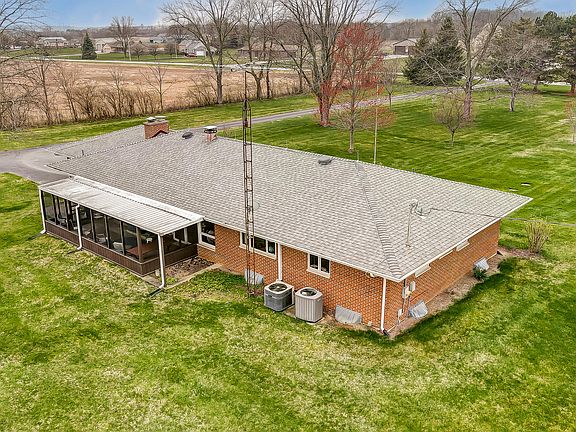 Welcome to a Great Hobby farm.The square footage includes 750' of finished lower level. The first floor measures 1,918. The total first floor and the full basement measures 3,836!! A comfortable country home nestled in the center of 5 acres with a stocked fishing pond, approximate 50' x 100' and 45 x 60 pole barn. The square footage includes 750' of finished lower lever. Abundant wild life surrounds the property. As you enter the home, you're greeted by a warm and inviting atmosphere. The large rooms and cozy entrance will make you want to call home. The eat -in kitchen is a culinary haven, perfect for creating delicious meals and memories with loved ones. In the family room, a charming pellet stove sets the tome for cozy evenings spent in comfort. Venture into the living room, where Pella glass doors lead you to a screened -in porch, inviting the beauty of the outdoors in. Four bedrooms with hardwood floors. The lower level has a ventless gas log fireplace and a 15' counter with stools and storage.. The utility room/laundry room, partial finished , measures 11 x 22. Lower level also includes expansive space for woodworking, storage or customize to fit your needs. The possibilities are endless. A perfect spot for hosting guests.