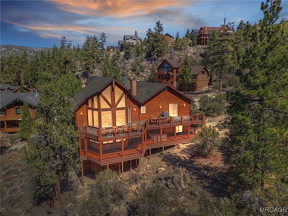 An elegant mountain retreat with unmatched views ~ Welcome to your Big Bear sanctuary, a five-bedroom masterpiece built in 2004, perfectly positioned on a peaceful cul-de-sac in the highly sought-after Castle Glen Estates, one of the most desirable neighborhoods in all of Big Bear ~ Designed with both relaxation and adventure in mind, this home offers the ultimate blend of comfort, luxury, and nature ~ Inside, soaring floor-to-ceiling windows invite natural light and frame breathtaking views of the surrounding forest and ski slopes, while slate flooring adds timeless sophistication to the open-concept design ~ Expansive living spaces and an enormous game room filled with pure fun, create the perfect atmosphere for entertaining, while a private hot tub offers the ultimate retreat after a day of adventure ~ You can’t miss the oversized four car garage with room to store all your mountain toys ~ Out back, the property opens to private acreage with beautiful viewa ~ From your southwest-facing deck, you’ll enjoy golden sunsets, panoramic forest and ski-slope views, and dazzling night skies filled with shooting stars ~ Towering pines and dramatic boulders complete the serene mountain backdrop, all while being just minutes from Big Bear’s activities ~ For summer fun, the nearest marina is only a two-minute drive making boating, fishing, and lakeside relaxation effortlessly accessible ~ Children can safely play and ride bikes along the quiet cul-de-sac while you savor peaceful evenings surrounded by nature ~ This exceptional retreat in Castle Glen Estates is more than a home it’s a lifestyle ~ Whether used as an investment, full-time residence or seasonal getaway, this home is waiting for you to make it your own ~ All furnishings can be included ~ Come enjoy Big Bear in luxury.