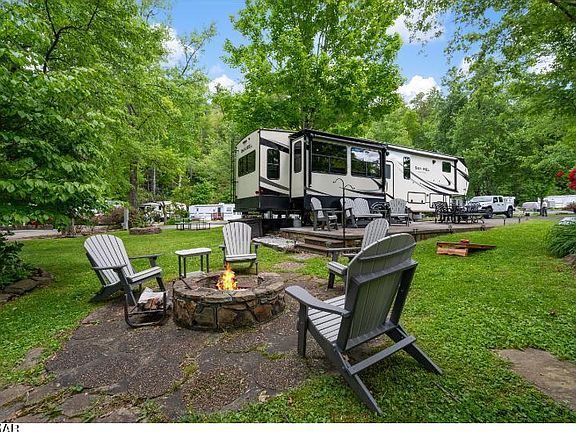 Enjoy the Smoky Mountains in this 2-bedroom, 1.5-bathroom fifth wheel with an additional loft. It is perfectly situated along the creek with a built-in firepit, private patio, and spacious grassy area to relax and enjoy the sounds of the water. Inside the 2022 Forest River Sanibel, you'll find the comforts of home with room to sleep 6+ comfortably. The master bedroom features a king-size bed and washer/dryer hookup, while the second bedroom offers bunk beds and a private half bath. A full bathroom is located in the hall, along with an additional lofted queen bed. The living area includes two recliners, a pullout sofa, and a fireplace, while the kitchen is equipped with a full-size refrigerator, pantry, and dining area.