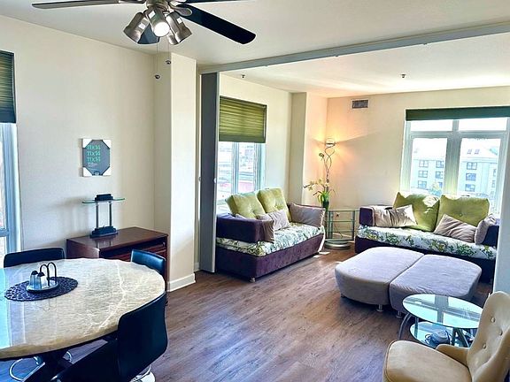 Turnkey Downtown Oakland, fully furnished, 1 BR, 1BA, with secure garage parking, secure entrance and rooftop views, is available to rent. This cozy downtown apartment is filled with natural light and was built with extensive soundproofing in the walls and windows. Finishes include: granite counter tops, wood kitchen cabinets, wood flooring, tile flooring, carpeting, glass door tub enclosure, central A/C/heat and ceiling fans. The apartment includes all the furnishings of a turnkey unit: Plates, cookware, utensils, flat screen TV's, cleaning supply's, and much more. The bedroom hosts a collapsible Murphy Bed and desk. The living room couches and ottomans can be coordinated to sleep 4. The stainless steel appliance package includes: Refrigerator, dishwasher, gas stove, microwave, and a stack washer/dryer. The building amenities include: Secure entrance, secure parking, 3 sets of elevators, community meeting room and an amazing roof top viewing area.