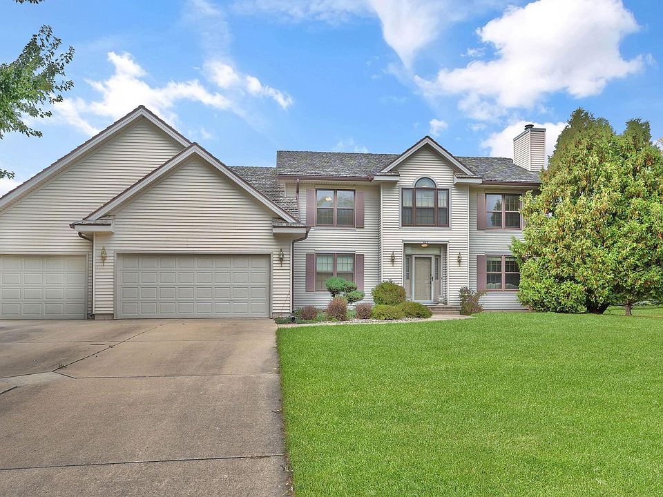 Expansive two story on a quiet cul-de-sac! Tucked away on a peaceful cul-de-sac and close to elementary and junior high schools, this spacious two story home offers room to live, relax, and entertain. Step inside to find a traditional floor plan filled with warmth and functionality. The inviting formal living room features a beautiful fireplace and large windows overlooking the front yard and quiet street. Just off the living room is the formal dining room, perfect for hosting larger meals and gatherings. The well designed kitchen offers an abundance of oak cabinetry, a pantry, ample counter space, and a built-in desk area. A breakfast nook adjacent to the kitchen provides access to the deck and backyard and leads to the main floor family room with a brick surround fireplace and large windows overlooking the rear yard. You’ll also find a convenient main floor office, half bath, and laundry room. Upstairs, all bedrooms are thoughtfully separated from the main living areas. The expansive primary suite features a vaulted ceiling, spacious bathroom with dual-sink vanity, separate tub and shower, and a large walk-in closet with additional storage above the garage. Three more generously sized bedrooms and another full bath with dual sinks complete the upper level. The finished lower level is ideal for entertaining or relaxing, offering large family and recreation areas plus an additional bathroom and plenty of storage space. Outside, you’ll love the .64-acre lot, peaceful cul-de-sac setting, and expansive backyard, perfect for outdoor activities or quiet evenings on the large deck. A spacious three stall garage rounds out this impressive property. Come see all the space, comfort, and convenience this wonderful home has to offer!