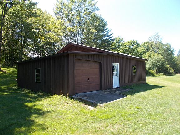This 2 bedroom home would also make a super great camp as it has a full finished basement on 11.58 acres (2 parcels). Oak kitchen comes with all appliances and has an island/breakfast bar. Open floor plan with beamed cathedral ceilings in living room and kitchen/dining room. Laundry chute to basement laundry area. There are 4 sets of S/G doors, with a double set off living room that opens up to a large side deck. There is a carport underneath the deck that also makes a great patio area. The finished basement gives you an additional 880 Sq. Ft. of living space, has beamed ceilings, spiral staircase to the main level, is partially carpeted and has a pellet stove for supplemental heat. Sliding glass doors in basement to carport/patio area. There is a geothermal heating system in this home which is a super efficient heat. Small spring fed pond could be made larger. There is a 2 car det. garage with an attached 1 stall garage w/concrete floor. Beautiful setting back off the road!!