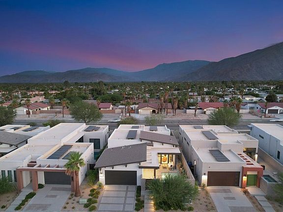 Exclusive private gated community of Miralon in Palm Springs, just minutes from downtown! This home comes with OWNED SOLAR, providing energy efficiency, savings, and long-term value. The private yard features a sparkling 8x15 cocktail pool with tanning shelf and umbrella sleeve, outdoor shower, programmable pool heater, drip irrigation, and landscape lighting--all framed by a peek at the San Jacinto Mountains. Inside, the modern open floor plan is filled with natural light. The kitchen boasts premium Bertazzoni & Bosch appliances, a Samsung refrigerator with interior beverage center, crisp white cabinetry, and a large island with bar seating. Smart home upgrades include Brilliant switches, Honeywell smart thermostat, programmable exterior lights, Ring system, and keyless entry. All bedrooms are spacious, including a primary retreat with outdoor access. With 3.5 baths, three with walk-in showers, the home blends comfort and style. Community amenities include lakes, dog parks, walking trails, plus a clubhouse with pools, spa, gym, yoga/Pilates, bar, demo kitchen, herb gardens, and more!