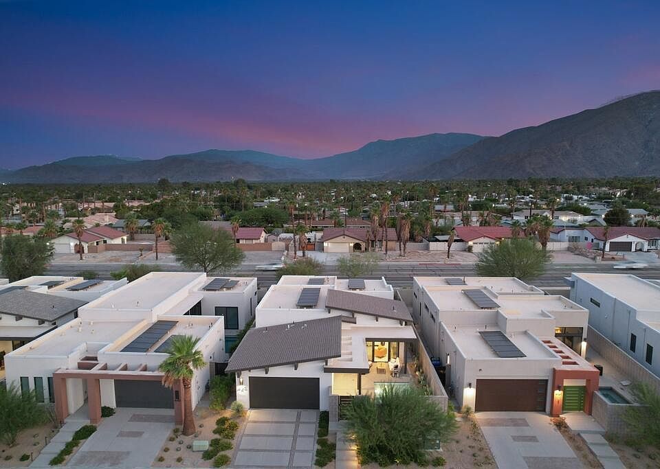 Reduced and priced to sell ! Exclusive private gated community of Miralon in Palm Springs, just minutes from downtown! This home comes with OWNED SOLAR, providing energy efficiency, savings, and long-term value. The private yard features a sparkling 8x15 cocktail pool with tanning shelf and umbrella sleeve, outdoor shower, programmable pool heater, drip irrigation, and landscape lighting--all framed by a peek at the San Jacinto Mountains. Inside, the modern open floor plan is filled with natural light. The kitchen boasts premium Bertazzoni & Bosch appliances, a Samsung refrigerator with interior beverage center, crisp white cabinetry, and a large island with bar seating. Smart home upgrades include Brilliant switches, Honeywell smart thermostat, programmable exterior lights, Ring system, and keyless entry. All bedrooms are spacious, including a primary retreat with outdoor access. With 3.5 baths, three with walk-in showers, the home blends comfort and style. Community amenities include lakes, dog parks, walking trails, plus a clubhouse with pools, spa, gym, yoga/Pilates, bar, demo kitchen, herb gardens, olive tree groves and more!
