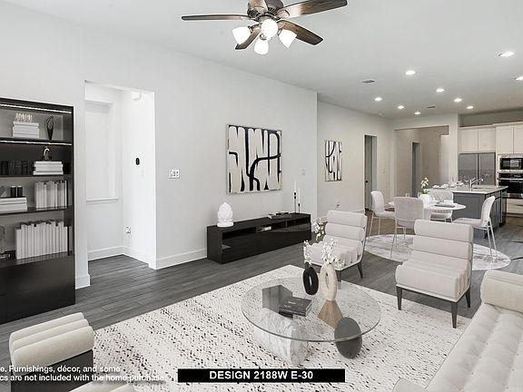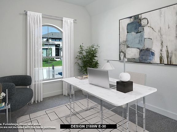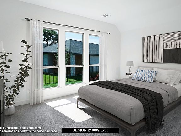 Extended entry with 12-foot ceiling leads to open kitchen, dining area and family room with 10-foot ceilings throughout. Kitchen features corner walk-in pantry and generous island with built-in seating space. Family room features wall of windows. Primary suite with 10-foot ceiling and wall of windows. Dual vanities, garden tub, separate glass-enclosed shower and large walk-in closet in primary bath. A Hollywood bathroom connects to bedrooms three and four. All bedrooms feature walk-in closets. Covered backyard patio and 7-zone sprinkler system. Mud room off two-car garage.