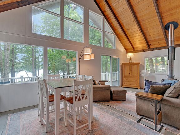 Step inside to discover a thoughtfully updated interior, where bright, open spaces create a welcoming atmosphere. The spacious living room features large windows that frame breathtaking lake views, while the cozy wood stove adds a touch of warmth during chilly evenings.