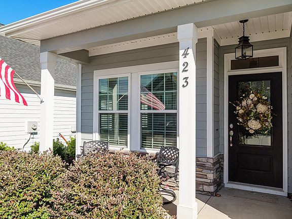 Welcome home to 423 Longmeadow Drive in beautiful Crawford Creek subdivision! This 1597 sqft ranch style home features 3 bedrooms, 2 bathrooms, a double attached garage, and a partially fenced backyard. The rocking chair front porch welcomes you into the bright foyer where you will find a formal living area or office space with beautiful wood floors and an abundance of natural light. As you enter the main living area, you discover an open floor plan offering a well equipped kitchen with stainless appliances, granite countertops, and tile backsplash. The kitchen opens to the dining area which flows into the generous great room featuring a gas fireplace. The primary bedroom is located in the rear of the house and boasts a lovely tray ceiling with ceiling fan, a custom built walk-in closet, and an attached bathroom with a custom tile shower, water closet, and double vanity. There are two additional bedrooms that share a hall bathroom that features a tub/shower combination, as well as a laundry room. Outside you will discover a covered patio with ceiling fan overlooking the partially fenced backyard. Don't miss out on this like new energy efficient ranch in beautiful Crawford Creek!