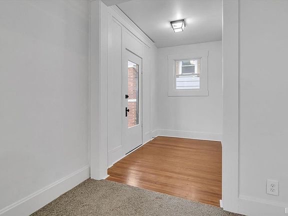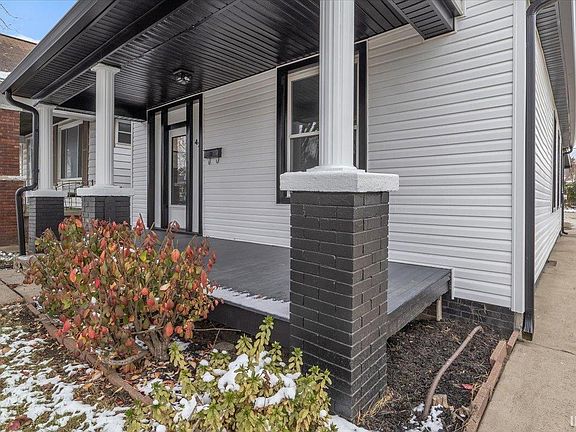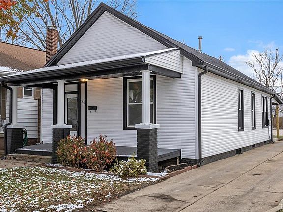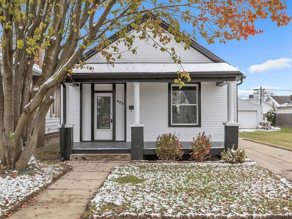 This north side gem is FULLY remodeled inside and out! The new white vinyl siding contrasts nicely with the new roof and black gutters, facia, trim, and soffit. Front covered 20x6 porch and rear 16x7 covered porch give two areas for outside entertainment. Step inside to a foyer and living room with new carpet and electric fireplace with twin bookshelves. Open concept in design, the dining room with refinished hardwood flooring flows to the brand new kitchen. The kitchen has brand new LVP flooring, new island, cabinets, stainless appliances, and main level laundry. Two large bedrooms with refinished hardwood flooring and large closets are connected by a full bathroom with a custom ceramic tile tub/shower surround, new vanity, lighting and LVP flooring. The modern updated windows, lighting, fixtures, ceiling fans, and most drywall all complement nicely with the wide trim and original transom. For storm protection and storage, there is access through a new bulkhead door from the back patio the unfinished basement, where you will notice the brand new furnace, water heater, and updated plumbing and electric. Rear gravel parking and shared driveway. This home is ready for move in and enjoyment.
