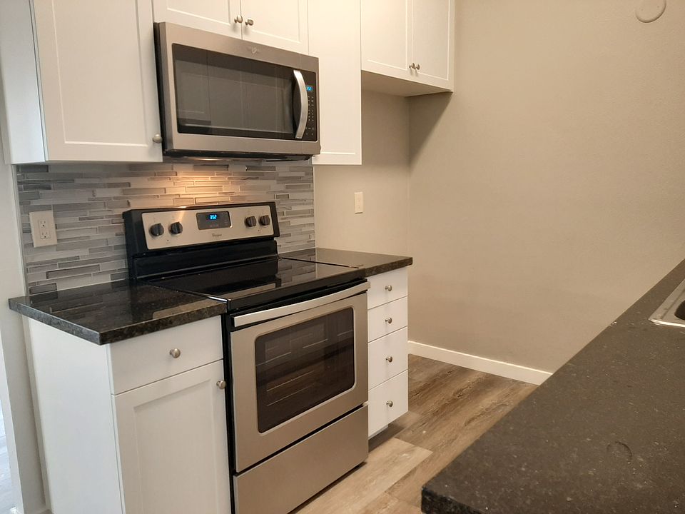 Beautiful completely remodeled 2 bed. This is the nicest unit you will find! New windows, doors, flooring, custom 2 tone paint, kitchen cabinets, granite, custom glass back splash, stainless steel appliances, plumbing fixtures, hardware, blinds, 3 ceiling fans, furnace, light fixtures. Fireplace, onsite laundry, carport, 2 assigned parking spots. Quiet small 4 plex with secure gated entry.