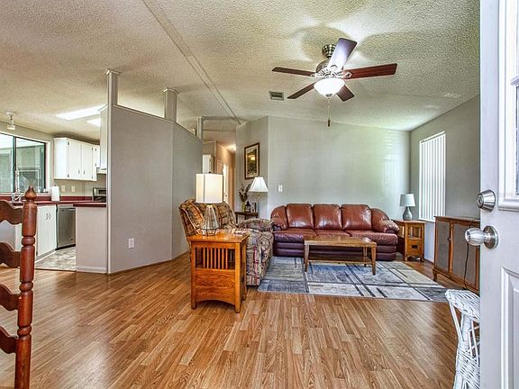 This beautiful 2 bedroom 2 bath home located in the highly desirable 55+ community of Fox Run is located close to stores, restaurants, and shopping. As you walk in you notice the light and airy feeling as a result of the skylights and cathedral ceilings. The large kitchen with updated flooring and stainless appliances leads to the dinette which is surrounded by windows. The home's master bedroom is large and offers large closets with ample storage. A conveniently located laundry room is inside just to the back of the kitchen and just passed the laundry room you will enter the enclosed porch which accesses the carport; it's a great spot to enjoy the outside while the 12 x 22 storage area could be a great place for your expanded storage, hobby room, or " man cave". Enjoy the ongoing social activities the community offers for a low monthly HOA fee. Centered around its Clubhouse you find two pools one of which is a short walk from the home, the boater will also enjoy access to the "Harris Chain of Lakes" via the community boat ramp or marina.