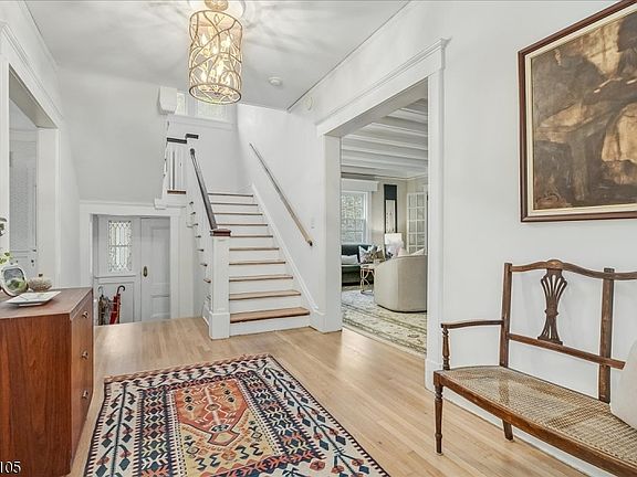 Prepare to fall in love! 423 N. Ridgewood in South Orange is a grand center hall Colonial filled with character and charm. This one of a kind home offers space and tranquility plus proximity to downtown train and town. The estate-like .58-acre yard features a back patio for entertaining and plenty of room to play or add a pool. Step into the impressive foyer with leaded glass windows and high ceilings, and you'll know you've arrived somewhere special. The spacious dining room is bathed in light from new windows. The renovated, eat-in kitchen offers a large walnut-topped island, wall oven, six-burner stove, Bosch dishwasher, and direct access to the yard. A butler's pantry, mudroom, and powder room add convenience. Entertain in the elegant living room with coffered ceilings, or through double French doors into the one-of-a-kind "Vermont room featuring a grand fireplace, custom built-ins, and exposed beams. Upstairs, find second-floor laundry and two separate bedroom wings. Wing one includes two bedrooms, a shared full bath, and a connecting play/homework room. Wing two offers a guest room with dedicated bath and a stunning primary suite with dressing room and ensuite bath with soaking tub and separate shower. The top floor adds three more bedrooms, a large rec room, and two full baths. With abundant storage, a 5-year-old boiler, and mini splits on each level, comfort and peace of mind are built in.