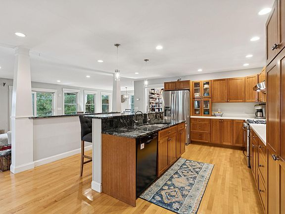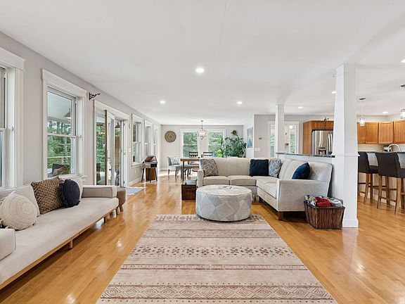 Perched atop a scenic hill, this stunning home offers panoramic views of iconic Sabbathday Lake. Just four minutes from Outlet Beach and the public boat launch, the location provides easy access to swimming, boating, and year-round outdoor recreation. Inside, an airy open-concept layout combines comfort and style, perfect for both entertaining and everyday living. The heart of the home is a beautiful cherry kitchen with granite and Corian countertops, ideal for casual breakfasts or gourmet meals. The spacious living room features gleaming maple floors, a cozy woodstove, and a wall of windows framing the lake views. A first-floor room, ideal for an office or playroom, completes the main living space. Step outside to the 14' x 40' mahogany porch to enjoy morning coffee, evening cocktails, or simply take in the scenery. The primary suite is a true retreat, featuring a whirlpool tub, steam shower, and double closets. Additional large bedrooms offer ample space for family or guests, while the finished daylight walk-out basement with a full bath and an additional room provides flexible space for a home office, gym, or guest quarters. A detached newly constructed barn with storage above adds exceptional versatility, perfect for cars, a boat, or future expansion. Additional features include a new roof, a standby whole-house generator for peace of mind, and much more. This is a rare opportunity to own a home that combines luxury, functionality, and breathtaking views in one of Maine's most desirable lake communities.