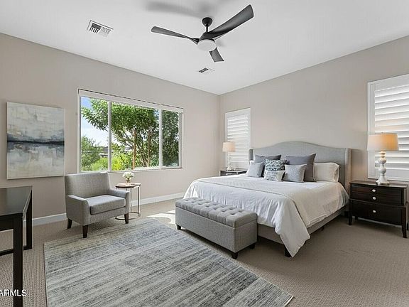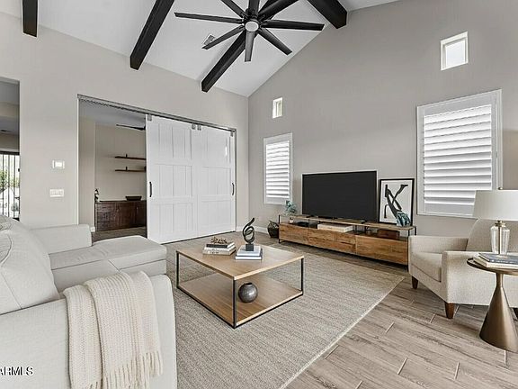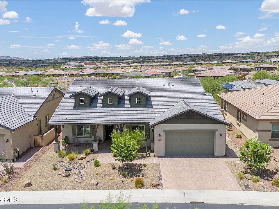 Welcome to 4230 Blacksmith Way! This beautiful home captures sweeping 180° desert and mountain views while blending modern elegance with desert charm. Fully paid solar, spray foam insulation, and a 3-zone cooling system help keep energy costs low. Inside, soaring beamed ceilings, wood-look tile flooring, and a large wall of sliding glass doors create a bright, open ambiance filled with natural light. The chef's kitchen features granite counters, stainless steel appliances, custom cabinetry, a walk-in pantry, and a spacious island perfect for gatherings. The home flows effortlessly into the dining and living areas for seamless entertaining. Step outside to enjoy low-maintenance landscaping and both covered front and back patiosideal for relaxing, entertaining, or watching stunning sunsets. The primary suite offers tranquil views and a spa-inspired ensuite with a standalone soaking tub, dual vanities, and a large walk-in shower. All three bathrooms showcase stylish tilework and modern fixtures. A spacious driveway and full 3-car garage provide ample room for vehicles, a golf cart, and storage. With a hot water recirculating system and thoughtful upgrades throughout, this home truly has it allready to experience the exceptional Wickenburg Ranch lifestyle.
