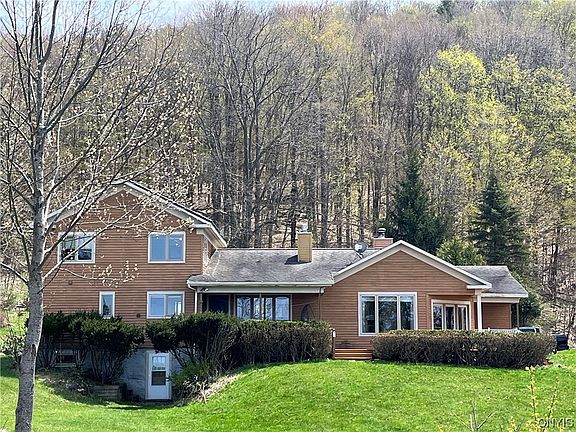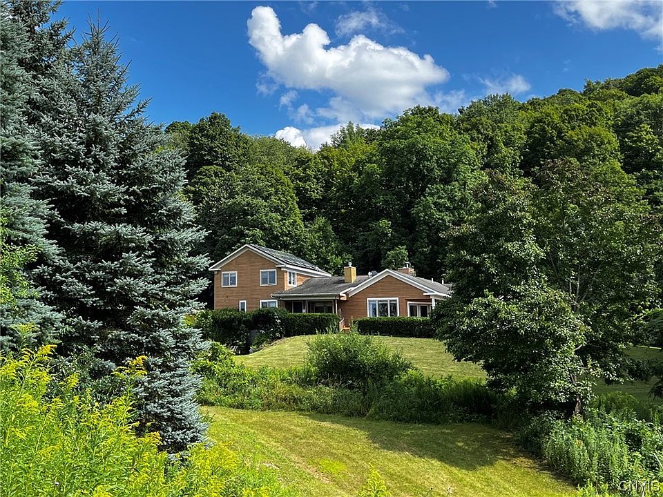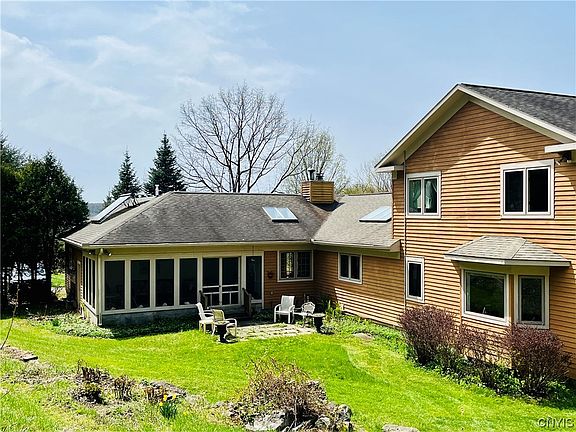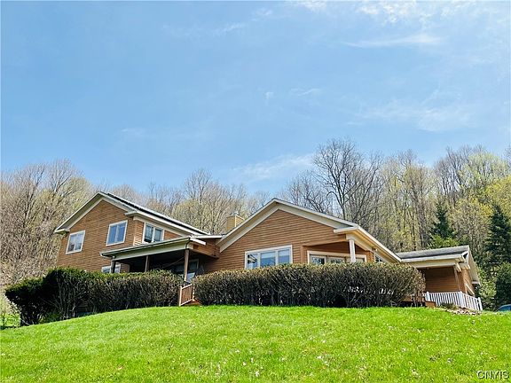 ONE-OF-A-KIND CUSTOM BUILT HOME: skillfully planned for maximum flow, function & design, and optimized for natural light & views. This Transitional home provides the best of both modern & traditional styles with its ability to separate private, semi-private & entertainment spaces and still provide easy flow and an open feeling. Featuring hardwood floors, extra large windows & skylights, extra deep custom cherry cabinetry, Corian & quartz counters, walk-in pantry, fireplace, Jotul woodstove, central vac, solar panels, full walk-out basement w/ work-out space, family room, wine/canning cellar & huge storage area, and attached 2-car garage. Plus a 2-story barn & workshop, oversized metal-frame shed, lighted low-maintenance organic perennial landscaping, grapes, raspberries, asparagus & rhubarb patches, fenced in veg. garden, raised beds and space to add a guest cottage with separate water & septic already in place. This ultimate private 32 acre+ setting of woods & meadows with a pond & seasonal brook and its own private spring water source is just a hop, skip & jump to Colgate & Hamilton Colleges or Syracuse & Utica. Come see the show stopping vista over the valley for yourself!