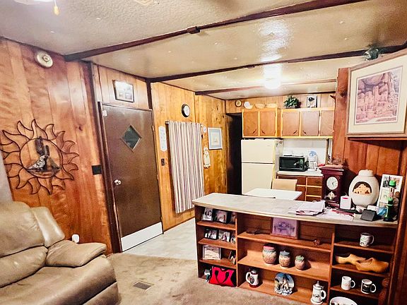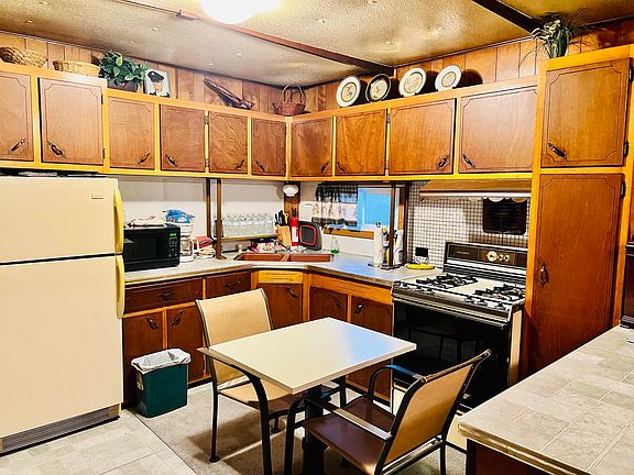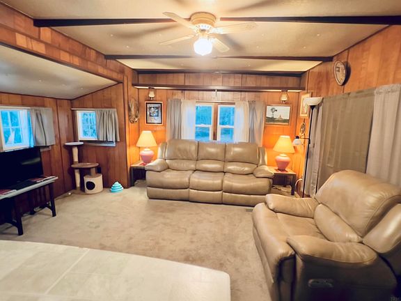 Furnished older mobile home in Holiday Woods sitting on 2 lots next to a beautiful wooded area. This home features 2 BR, 1 BA with a 1 car detached garage. All appliances, LR, kitchen & BR furniture stay with the home. This home has had a complete makeover! New water heater, bathroom remodel, new flooring and Pex water lines throughout. A great enclosed front porch. Outside has been repainted, 13 new double pane windows installed, roof recoated with fibered aluminum roof coating. And you will have access to Silver Lake. Home is being sold AS IS.