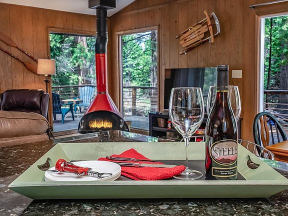 Private lotClassic mountain soulModern flairWarm inviting spaceSingle levelPeaceful roadBright orange wood-burning stove