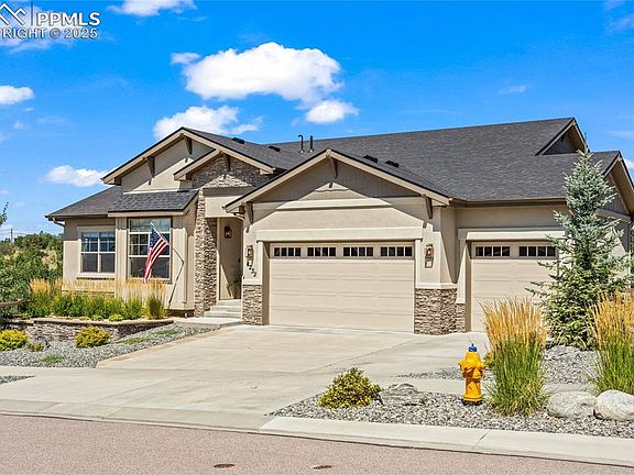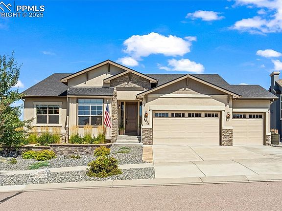Welcome to this stunning Goetzmann Custom Home. this property showcases exceptional craftsmanship and countless high-end upgrades throughout. Step inside to soaring 9-foot+ ceilings and a spacious Great Room with a striking floor-to-ceiling stone fireplace and vaulted ceilings, perfect for both everyday living and entertaining. The gourmet kitchen is a chef’s dream, featuring granite and quartz countertops, premium appliances, and rich alder cabinetry and trim. Escape to the luxurious primary suite, featuring dual vanities, an oversized walk-in shower, a spacious walk-in closet, and a spa-inspired 5-piece bath designed for ultimate relaxation. Additional highlights include hardwood flooring, 8-foot alder doors, and meticulous attention to detail in every room. Step outside to experience resort-style living with professionally landscaped, award-winning grounds with breathtaking views of Pikes Peak. Entertain with ease around the stunning outdoor fireplace, relax in the luxurious hot tub, and enjoy the fully equipped stone island featuring a built-in BBQ grill, refrigerator, and kegerator—perfect for hosting unforgettable gatherings. Property includes an exterior RV hookup and a dedicated electric vehicle charging outlet conveniently located in the garage. Insulated garage with sleek epoxy-coated flooring. Window well covers for added safety and protection. Located in a vibrant master-planned community with a heated outdoor pool, fitness center, clubhouse, playgrounds, miles of scenic hiking and biking trails. You’ll love the convenience of being just minutes away from shopping and dining. This home is truly a custom masterpiece with designer touches throughout. Must see to appreciate.