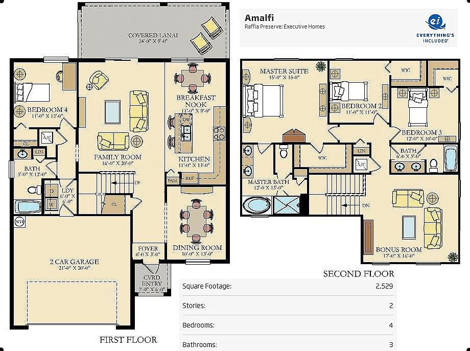 Amalfi model, Raffia Preserve: Executive Homes. 2 story home near the clubhouse pool, gym and children playground. Flair abounds in this ideal family home with a perfectly designed 2,529 square foot home. This home features 4 spacious bedrooms for friends and family, 3 full bathrooms, a large kitchen with cozy breakfast nook. This model also features a large second floor bonus room good for an office. The covered lanai is perfect for relaxation day and night. While the dining room and great room, converge for endless entertaining options. The beautiful Raffia Preserve community features exquisite WCI Lennar home models. Nestled between a scenic collage of lakes and numerous outdoor spaces, Raffia Preserve offers year-round enjoyment for residents both young and young at heart. Minutes away from shopping, dining, healthcare and schools, Raffia Preserve has something for everyone to live the life of comfort and convenience in beautiful lush Florida surroundings.