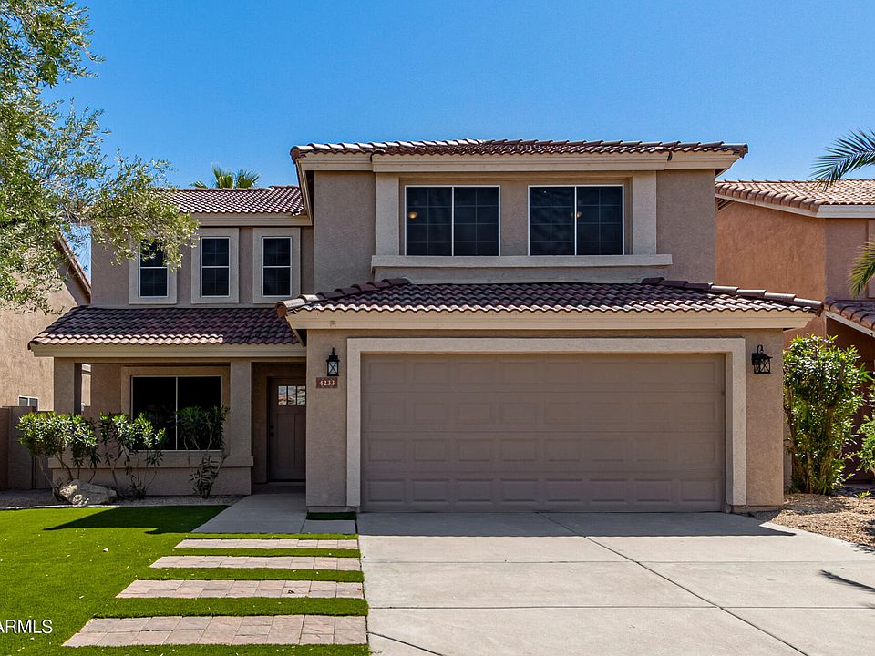 Experience this delightful 2-story home in Mountain Park Ranch, which enchants you with its high vaulted ceilings and elegant wood-look floors, featuring 4 bedrooms and 2.5 bathrooms, living and dining room and Eat in kitchen, complete with a cozy fireplace, perfect for relaxing evenings. Culinary enthusiasts will adore the well-appointed kitchen, featuring sleek white cabinetry, stylish tile backsplash, gleaming quartz counters, and a convenient walk-in pantry. Stainless steel appliances, a chic dry bar with a built-in wine rack, and a center island with a breakfast bar enhance the kitchen's charm and functionality. Retreat to the spacious main bedroom, a haven of comfort with plush carpeting, an ensuite boasting dual sinks, a soothing soaking tub & Walk in shower & Walk in close The home also includes a cozy loft, ideal for a home office or creative space. Step outside to the sizable backyard, where a covered patio, lush grass, and a paver patio await, offering ample space for a pool if desired. Come and experience the comfort and style of this lovely Mountain Park Ranch residence!