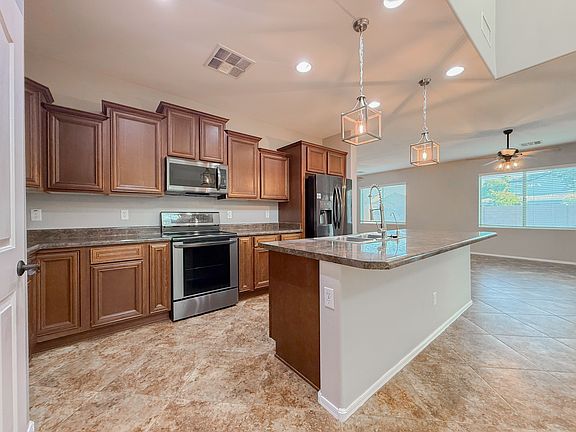 Inviting 4/3 San Tan Valley House - Park Views & Modern Comfort! This beautifully designed home features tile, wood-plank style, and carpet flooring, a welcoming family room, and a modern kitchen with stainless steel appliances, oversized island, and ample cabinet space. The master suite offers a spa-like dual sink bath and an oversized walk-in closet. Cozy bedrooms and updated baths provide everyday comfort. Enjoy in-home washer/dryer, a 3-car garage, tranquil covered patio, and an oversized backyard with serene park views. Located near shopping, dining, and outdoor recreation - this home blends style, space, and convenience!