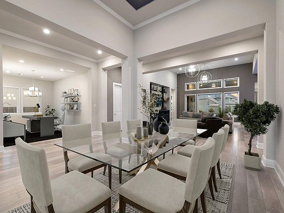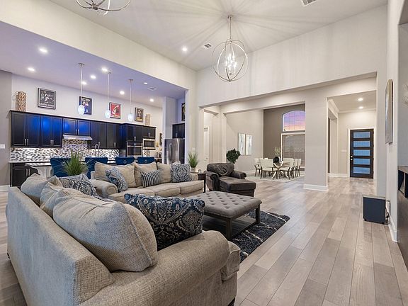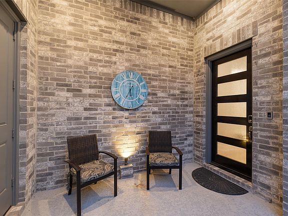 Luxurious single-story home in the highly sought-after Del Bello community featuring an elegant brick and stone elevation with gated courtyard entry. A grand foyer with soaring 16-foot ceilings opens to engineered hardwood floors, designer lighting, and an expansive open-concept living area ideal for entertaining. The gourmet kitchen showcases upgraded cabinetry, quartz countertops, oversized island with breakfast bar, double ovens, 5-burner gas cooktop, and a large walk-in pantry. The living room overlooks an extended covered patio with gas log fireplace and a private oversized backyard with no rear neighbors, offering ample space for a future resort-style pool. Patio is plumbed for gas and water for an outdoor kitchen. The owner’s suite features plush upgraded carpet, oversized shower, soaking tub, dual vanities, and two walk-in closets. A second primary bedroom with an ensuite bath is located at the front of the home. Nearly all builder upgrades selected. Move-in ready and must see.