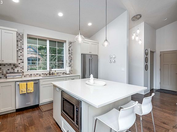 LARGE PRICE REDUCTION. Don't miss the opportunity to own this modern style home in established South Eugene neighborhood. This home boasts main level living in the South Hills, with open concept living. Living room, kitchen, office/den and primary bedroom suite on main floor. The kitchen features stainless steel appliances, including 5-burner gas range & a very generous island with built-in storage & quartz countertops.The primary suite features a large shower & separate soaking tub (with a large window overlooking the trees). Home also features large windows offering beautiful natural views from every room. Step out onto your large deck that runs the length of the house and enjoy the quiet peaceful forest view. Be sure not to miss the sounds of the seasonal creek in the winter months.Downstairs you will find a generous family room with a wet bar & a sliding door that leads to an additional covered deck & backyard acces, 2 bedrooms, full bath, and a convertible, unfinished storage room (or perhaps a wine cellar). Convenient access to freeway, short distance to UofO and shopping.