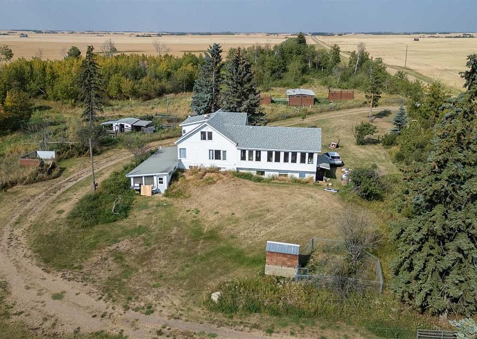 Just a few kilometers off Highway 36, south of Killam, this 5.85-acre property could be exactly what you’ve been searching for. Fully fenced and cross-fenced with multiple shelters, stalls, and pens, it’s perfectly set up to start your own hobby farm or acreage life.. A 30x50 Quonset with dirt floors offers plenty of space for storage, a workshop, or even a small barn. The home itself is spacious and well-suited for a growing family. On the main floor, you’ll find one bedroom, a 4-piece bathroom, a bright kitchen with ample storage, a dining area, and a cozy living room. Upstairs features three more bedrooms and a 2 piece bathroom. Over the years, this home has seen a number of updates, including vinyl windows, siding, shingles, flooring, and window coverings. A large addition filled with natural light makes the perfect space for entertaining and it also includes another 2 piece bathroom. From here, you’ll find access to the basement. There is another laundry area, a fully equipped kitchen with fridge, stove, dishwasher, and microwave, a 4 piece bathroom, and a small bedroom, plus direct outdoor access. The basement offers even more with ample storage, utility space, a workshop with 200-amp service and outside access, plus a cistern system pumped from the well. Both the workshop and the basement feature in-floor heating, while the furnace, though older, is in good working order. Outside, the yard is full of potential and charm with pear, apricot, apple, and cherry trees, as well as mature trees that provide privacy and shade. A wraparound driveway makes it easy to bring in RVs, stock trailers, or guests with ease. This property truly has it all with space, functionality, and the opportunity to create your own private oasis.