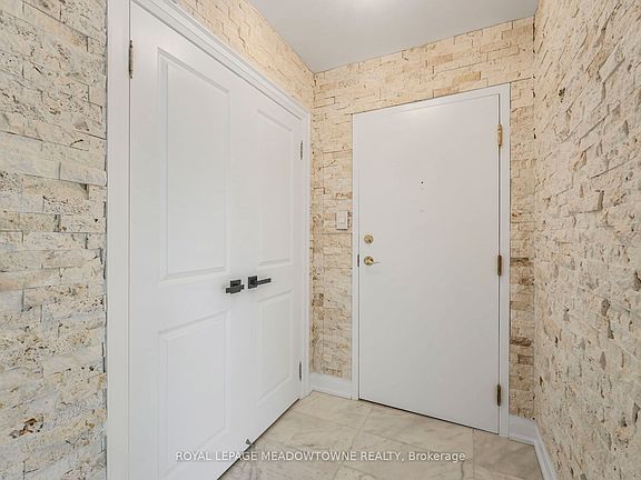 Welcome Home! Your Beautifully Upgraded Condo in the Heart of Mississauga Awaits! Come see this bright and inviting 2-Bedroom, 2-Bathroom CORNER UNIT condo that truly feels like home. Located in the absolute heart of Mississauga, this unit offers convenience, luxury upgrades, and a wonderfully quiet atmosphere-perfect whether you're starting out or looking to downsize. Close to major Highways, fantastic Shopping, schools, recreation, and places of worship. Plus, with this convenient second-floor unit, you don't even need the elevator to get in and out! It comes complete with 1 dedicated parking spot. This sun-drenched condo faces south and southeast, ensuring your main living areas are bright all day long and offer a lovely private view. You'll love the quality touches throughout. Gorgeous Marble Floors flow throughout the main living areas and bathrooms, giving the space an elegant, cohesive feel. The grand entranceway features a beautiful stone accent wall and a handy closet. Cozy up in the living room next to the fireplace! It's beautifully integrated with a built-in bookshelf and entertainment unit. Smooth Ceilings and a separate, modern Carrier heating system offer year-round comfort. Kitchen: Fully functional with a stylish backsplash, upgraded sink and faucet, and a full-size dishwasher. The clever moveable island with three drawers gives you flexibility and extra prep space! Primary Bedroom with hardwood floors, two closets (including a walk-in), and an indulgent Ensuite bathroom. Features a shower/tub combination, Corian counters, marble accents, an upgraded toilet, and a chic floating vanity. Second Bath: Features an upgraded glass shower stall with enhanced pressure control and two dedicated linen closets for excellent storage. With hardwood floors in the second bedroom (which also has great closet space). Insuite laundry for ultimate convenience. Unit is virtually staged.