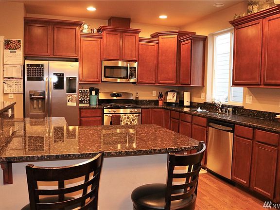 Beautiful & Spacious N Bellingham Home! This 4 bedroom home features an open kitchen/living & dining area. Gorgeous kitchen w/hardwood floors, ss appliances, granite counters large island/eating bar area. Huge living room w/gas fireplace. Big master bedroom with walk-in closet & slate tiled shower, double sinks, separate toilet area. 3 large bedrooms. Landing area upstairs has a built-in desk topped w/granite, use for office/sitting room. Covered back deck, fully fenced backs to a green belt.