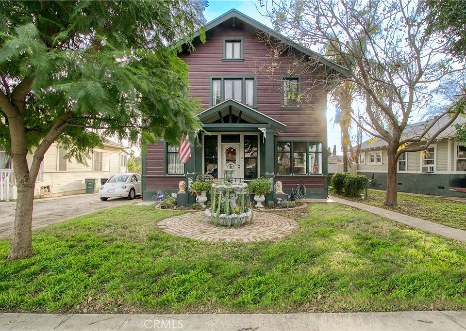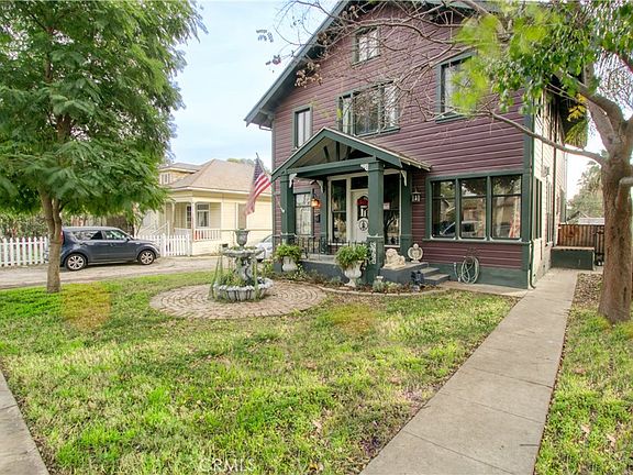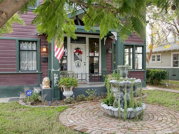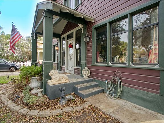 Located between the prestigious Wood Streets, Downtown Riverside, Mt. Rubidoux, Evergreen Memorial Park, and Riverside Community College. The prime location of this home allows you to watch fireworks from Mt Rubidoux right from your spacious backyard! This home features historical character with modern amenities. Formal foyer features wall to wall windows for plenty of light. Living room has wood flooring and crown molding and decorative stained glass rosettes. Dining room has luxurious details with sculpted ceiling medallion, sparkling chandelier, decorative art nouveau doorway art, as well as artistic ceiling corners. Galley kitchen features extra wide porcelain sink, remodeled Wedgewood stove with gas cooktop, plenty of cabinets, tin-ceiling-tile styling, and attached room features shelving for a pantry, as well as door to exterior backyard. Downstairs bedroom can be accessed from the kitchen or the living room hallway, has tiled floors and crown molding. In this bedroom there is an office with door, with an attached storage area with utility sink, that could be used as a closet. Combining these spaces gives you a large downstairs bedroom area. Downstairs bathroom is a half bath with tall ceilings. Next to bathroom is a large hallway closet that has potential to expand the downstairs bathroom space. Upstairs features ceiling medallion with chandelier over staircase, gorgeous golden bee pattern wall design, and a loft area with chair molding and designer citrus-colored floral wallpaper. Large laundry room upstairs with balcony overlooking backyard and almost 180 degree views of Riverside. Jack and Jill bathroom upstairs is located between the loft and a bedroom and features a tub/shower combo, a large sink vanity with double sinks, tile floors, and new bathroom light fixture. Two guest bedrooms feature wood laminate flooring, closets, and ceiling fan with lights. Primary bedroom is large L-shaped with double closets with sitting area, bed section, and en-suite bathroom. Bathroom features dual sink vanity, toilet, and decorative clawfoot tub. Home features a long driveway and gated parking area in backyard. Backyard has a workshop structure large enough to fit one car on front side, and more storage space for tools through a 2nd door towards the side. Lattice covered patio with pavers for a relaxing outdoor lounge area. Raised bed pond with goldfish and turtles. Backyard features fruit trees and grassy lawn.