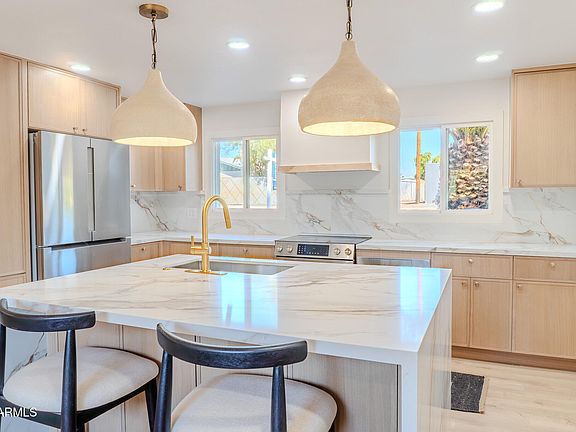 Newly remodeled in 2025, this tri-level home sits in a prime Scottsdale location with a stunning backyard view of the top of Camelback Mountain. A custom black wrought-iron front and side door open to a foyer enhanced with an Artesa glass pendant and a designer iron railing staircase. This true 4-bedroom, 2.5-bath home showcases a chef's kitchen with white oak slim shaker cabinetry, antique bronze hardware, Bosch stainless appliances, Avenida Del Sol quartz counters, and a dramatic waterfall island with seating and storage. Crate & Barrel Corfu ceramic pendants add a luxe finish. The dining area with accented ceiling opens to a bright great room. Outdoors, enjoy your private desert oasis with newly resurfaced Pebble Tec pool and fresh Kool Decking. City approval for garage if buyer builds