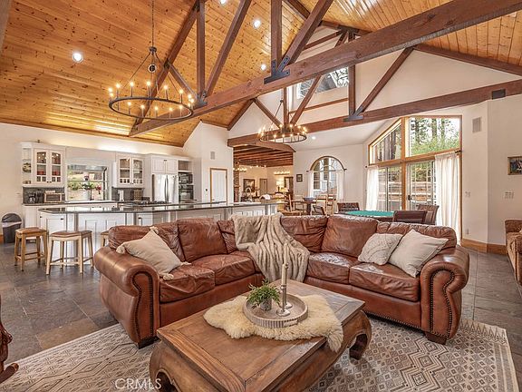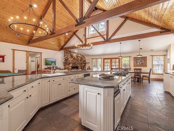 Welcome to this breathtaking, expansive mountain retreat offering the perfect blend of rustic charm and modern luxury, all set on a 1+ acre lot in the heart of Big Bear Lake. The open-concept design showcases a massive great room anchored by one of five cozy fireplaces, a spacious living room, and a large game room—providing plenty of room for everyone to spread out and relax. At the heart of the home is a fully equipped chef’s kitchen, complete with solid granite countertops, dual ovens, two sinks, and a huge island with seating for twelve—ideal for entertaining family and friends. This warm and inviting 5-bedroom, 4-bath home spans over 4,700 square feet and features stunning architectural details including lofted wood ceilings with exposed beams, intricate stonework, and walls of windows that flood the space with natural light. Whether you're gathering in the great room, enjoying quiet moments by the fire, or hosting guests in the game room, every space in this home has been thoughtfully crafted for comfort and style. Step outside to enjoy the mountain air from the private patio with hot tub, or explore the possibilities of the expansive one-acre lot. The property also includes a four-car attached garage, a detached garage, a circular driveway, and a second driveway offering abundant parking for vehicles, RV, boats and more. Perfectly located near the slopes, lake, and village, this home is an approved short-term rental with the City of Big Bear Lake for up to 16 occupants—making it not only a dream home but a smart investment opportunity. With over $30,000 in recent upgrades, its rare size, prime location, and impressive amenities, this mountain estate is truly one-of-a-kind. Priced to sell quickly – don’t miss this amazing opportunity!
