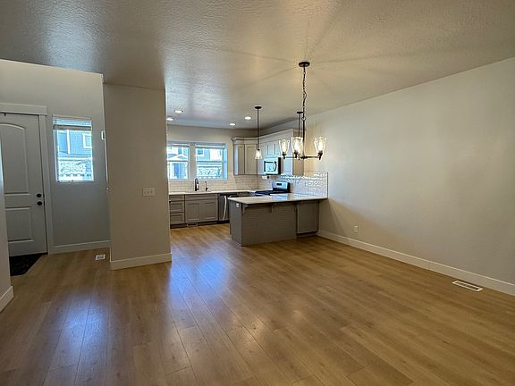 Beautiful townhome with vaulted ceilings in the open concept living space. The kitchen has shaker cabinets with stainless steel appliances, including a gas stove.