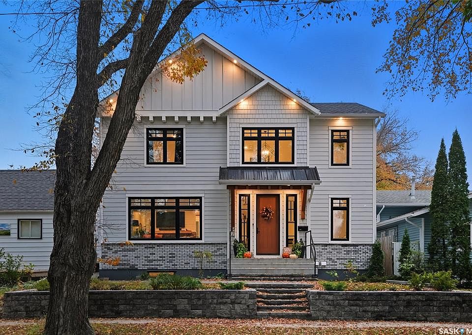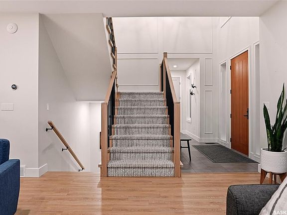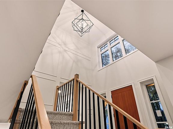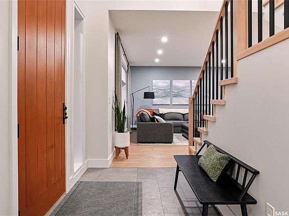 Welcome to 424 3rd Street East—an exceptional property in the heart of coveted Buena Vista. Set on a rare 43.75 ft × 125 ft lot, its unique width allows for a side-to-side layout rarely seen in BV. The home’s striking curb appeal features a stately façade framed by a stacked-block retaining wall, professional landscaping, and design by one of Saskatoon’s top residential teams. The rear is equally impressive with a full-width cedar deck and heated triple detached garage that doubles as an entertainment space. The garage is the largest permitted—34 ft wide × 26 ft deep (27 ft middle bay) with 10-ft ceilings, two 14 × 8 ft alley doors, and an 8 × 8 ft yard door. Built on a thickened-edge slab, it includes Wi-Fi, built-in audio, and commercial-grade entry. Spanning nearly 2,400 sq ft plus a finished basement, the home offers four bedrooms, 3½ baths, and two fireplaces. Comfort features include zoned in-floor heat below and multi-zone HVAC above. A grand two-storey foyer leads to a bright main floor with open flow, mudroom, elegant powder room, large living area with stone feature wall and two-sided gas fireplace, dining for ten, and a chef’s kitchen with professional built-ins, 2-inch butcher-block island, quartz counters, custom cabinetry, walk-in pantry, beverage centre, hidden coffee bar, and water chiller. Upstairs hosts three oversized bedrooms, large laundry, and linen storage. The primary suite boasts vaulted ceilings, a steam ensuite with in-floor heat, soaker tub, built-ins, private water closet, and custom walk-in. The basement features a spacious family room with built-in sound, guest bedroom, and four-piece bath. Thoughtful design conceals bulkheads, and the mechanical room includes a combi-boiler, auxiliary hot-water tank, multi-zone HVAC, smart irrigation, and audio hub. Extras include solid Safe-and-Sound doors, custom blinds, Lutron lighting, Sonos sound, and meticulous craftsmanship throughout.