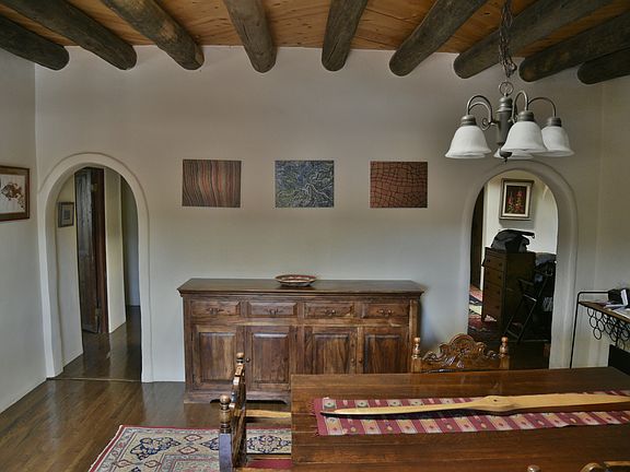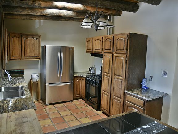 Spacious adobe home with high ceilings, sunken living room with picture window, vigas, Latillas, hardwood floors, Saltillo tiles, skylights and kiva fireplace. This old style southwest home was renovated in 2010 and incorporates modern conveniences.